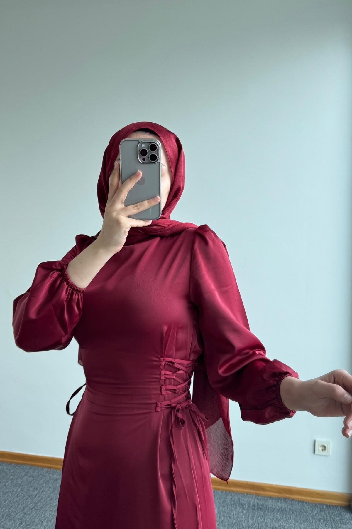 Waist Tie Detailed Satin Hijab Evening Dress Claret Red (EU-0285)