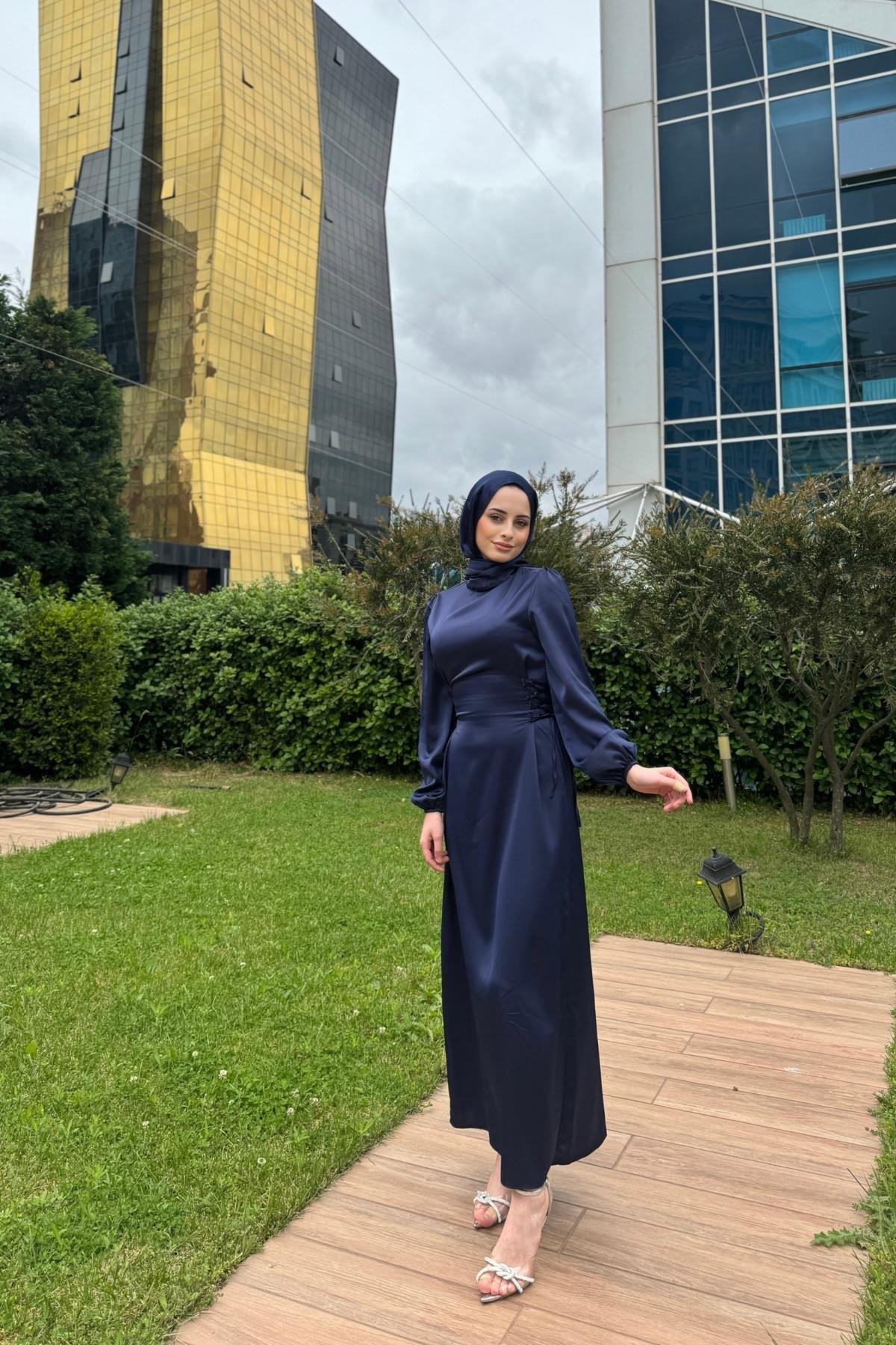 The meeting point of elegant details of design and elegance: Satin Hijab Evening Dress with Waist Tie Detail - Navy Blue; A sophisticated option that will make you stand out on your special occasions and emphasize your slim waistline.
