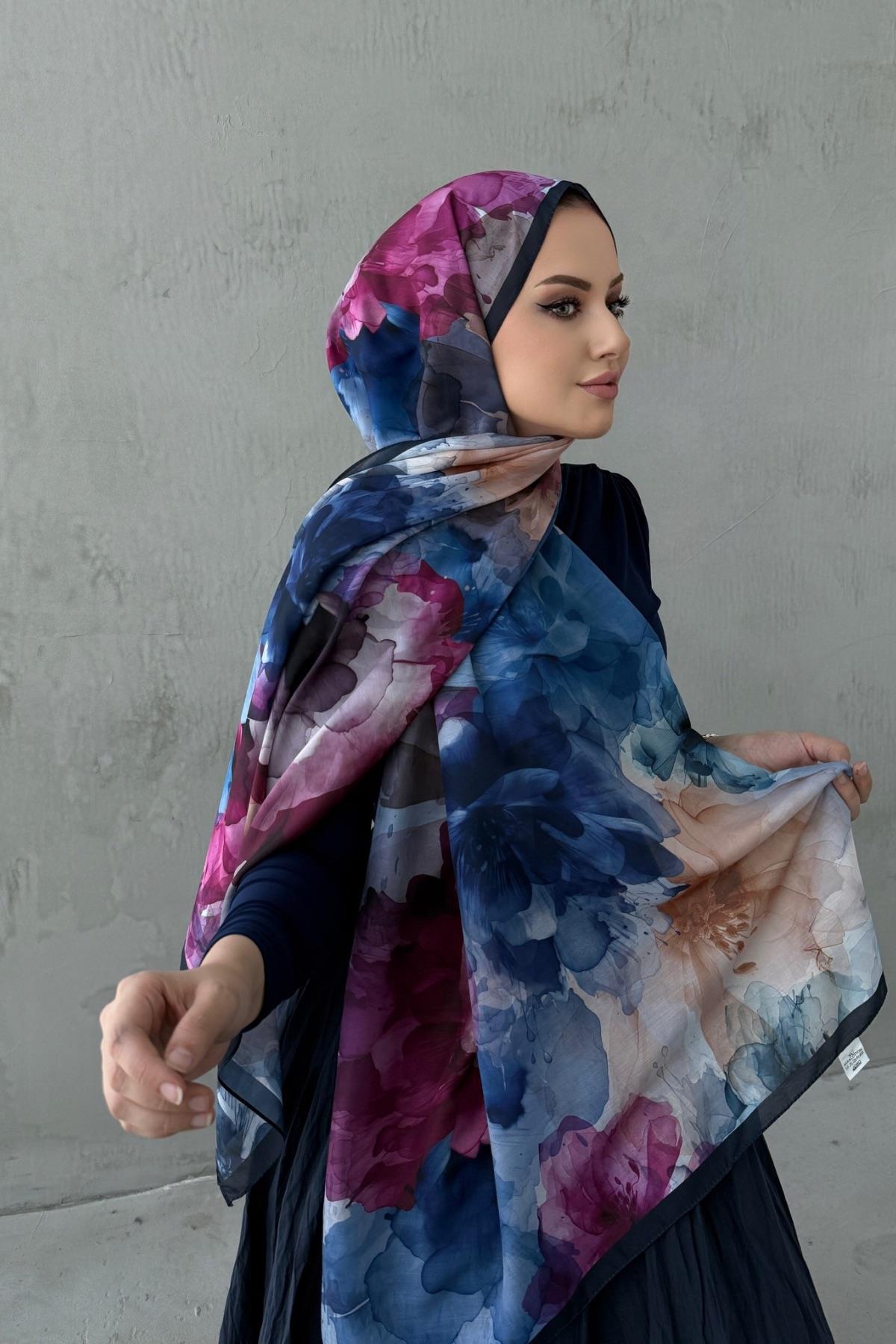Fuşya&Lacivert Nilüfer Bohem Modal İpek Şal (EU-0514)