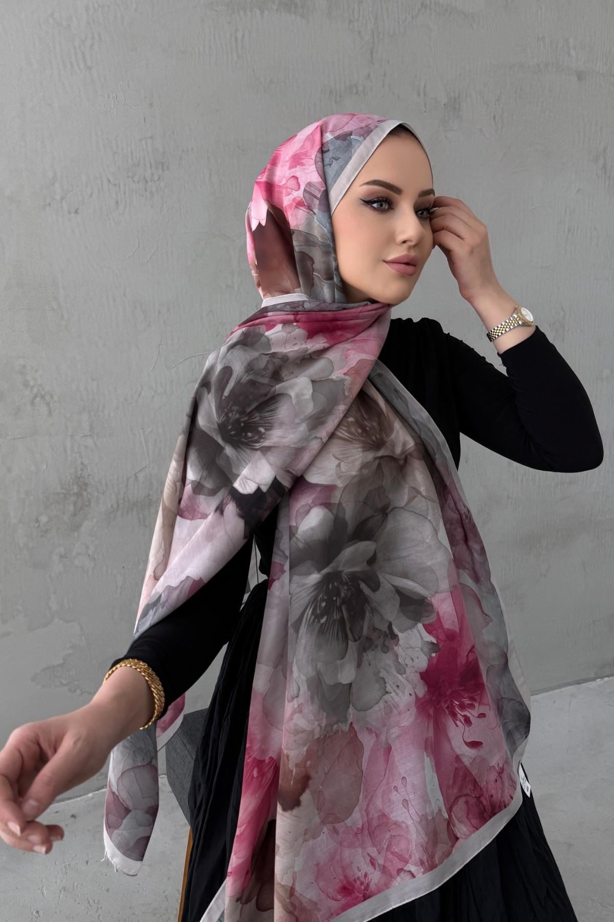 Gri&Fuşya Nilüfer Bohem Modal İpek Şal (EU-0514)