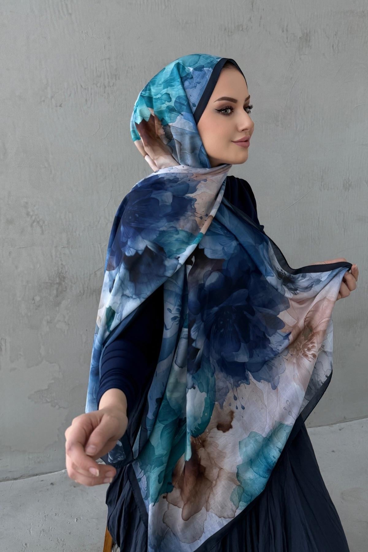 Lacivert Nilüfer Bohem Modal İpek Şal (EU-0514)